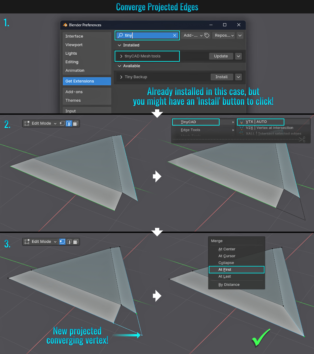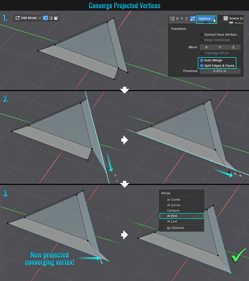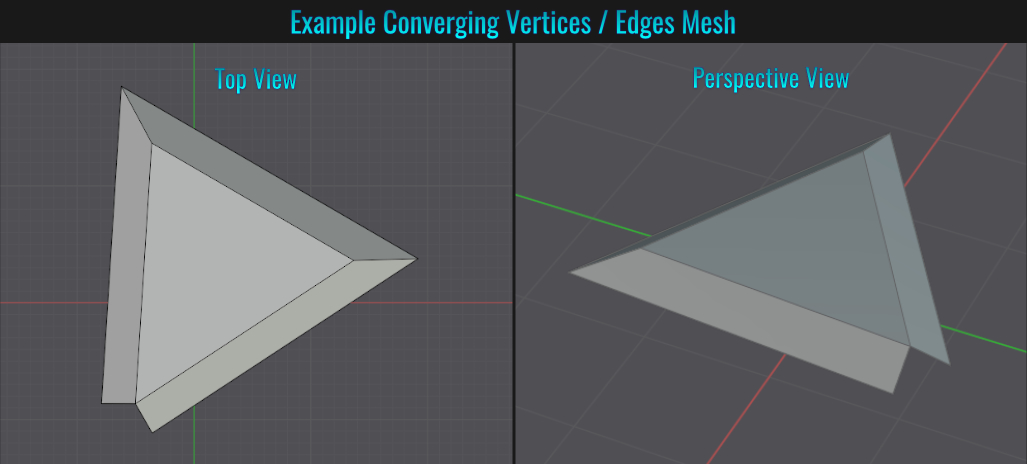 When it comes to trying to figure out how to converge two vertices on separate edges or the edges themselves, Blender has easy ways of achieving this. There will be two methods listed below: one that makes use of an add-on while the other does not. In this example, an extruded triangle has split vertices, one on each edge of which when converged would form the triangle's point. For good measure, a rotation was added and applied. You'll see that given the two methods listed here, this won't matter!